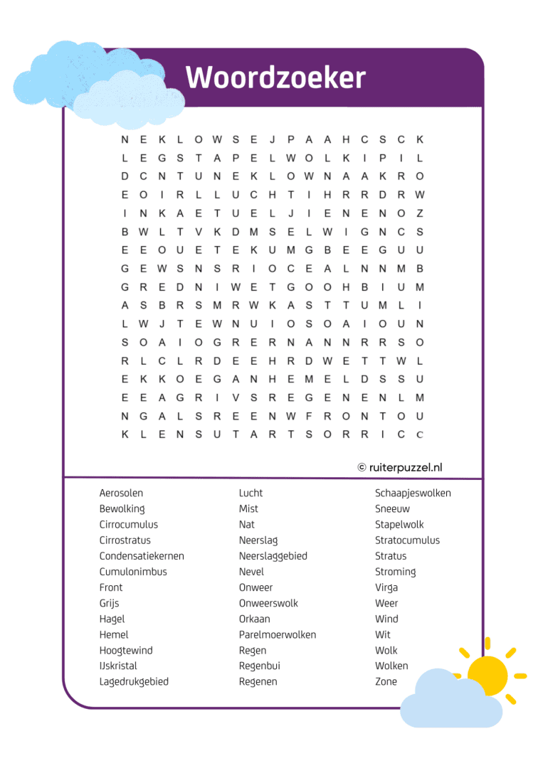 In elk woord zitten minstens twee letters die maar op één manier weg te strepen zijn. Als alle hieronder opgegeven woorden in het diagram zijn weggestreept, blijft er een aantal letters over. Lees deze letters regel voor regel van boven naar beneden, zo vindt je de oplossing. Veel puzzel plezier!