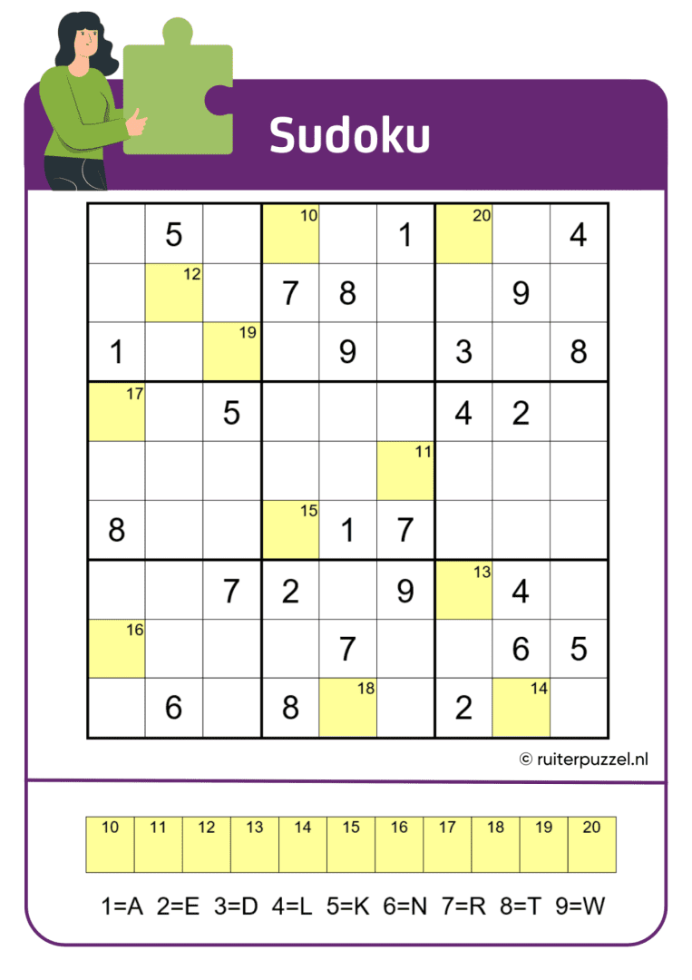 Puzzelen maar! Los jij deze sudoku op? Vul de cijfers 1 t/m 9 in. Vervang de gevonden cijfers in de gekleurde hokjes en bekijk de oplossing!